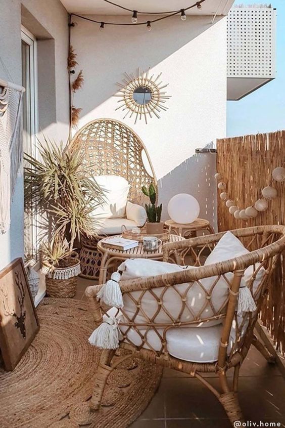 Pour créer cette atmosphère, vous pouvez ajouter des coussins et des plaids sur vos chaises et fauteuils. Les accessoires de déco en raphia ou rotin sont également très tendance pour le balcon et seront à privilégier. Les tapis de sol sont également des éléments d’aménagement de balcon indispensables ! Ils contribuent à donner du style et favorisent le bien-être.